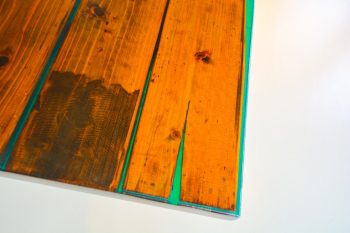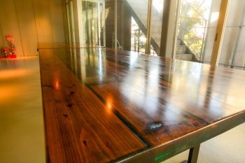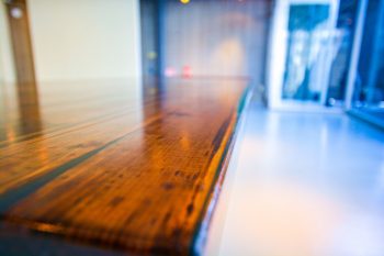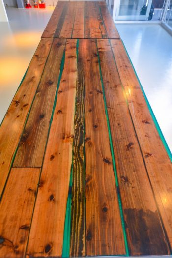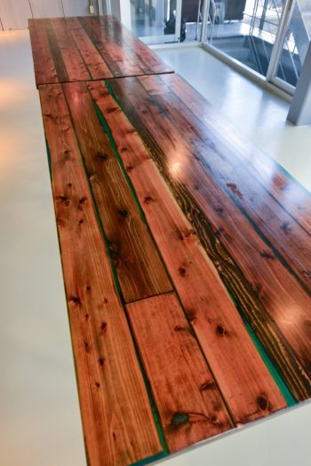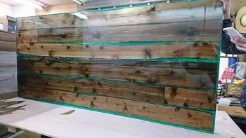 ガラスの上に木材を貼り付けて仕上げた机は、一見シンプルなのですが、近づいてみると別の一面をのぞかせるユニークなものになりました。