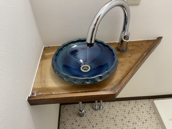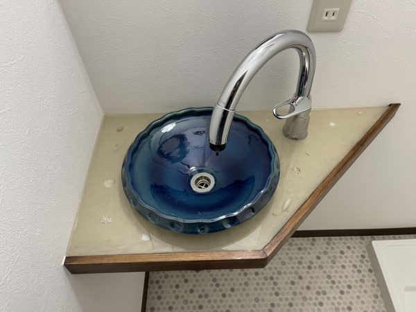 手洗い台は、砂浜のような質感に仕上げ、貝殻をアクセントにしてみました。